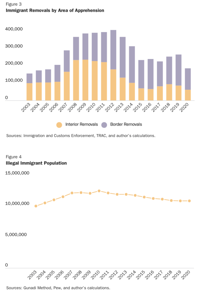 Although Trump succeeded in cutting legal immigration more than he initially planned, he oversaw the collapse of interior immigration enforcement. In 2020, the removal of illegal immigrants from the interior of the United States was the lowest as an absolute number and as a share of the illegal immigration population since ICE was created in 2003 (Figure 3). Trump failed to increase removals because local jurisdictions refused to cooperate with his administration, continuing a trend begun during the Obama administration in response to their deportation efforts. As a result, the population of illegal immigrants remained about the same as when he took office (Figure 4).