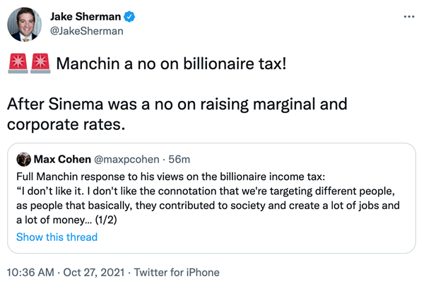 Over in the Senate, Joe Manchin – who is a key vote in passing Chuck Schumer’s socialist agenda – dismissed the latest tax proposal as a non-starter.